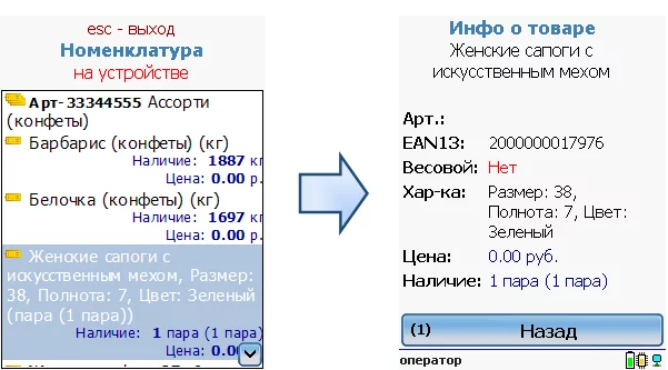 Для просмотра детальной информации по номенклатурной позиции, достаточно всего лишь выбрать ее из списка или отсканировать штрихкод товара.